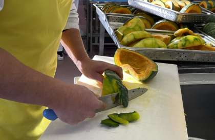 スイートパンプキンは、さつまいもとかぼちゃを半量ずつ使って作ります。かぼちゃは皮が硬いので、一度蒸してから皮を落としています。この後さらに蒸してさつまいもと共につぶしていきました。