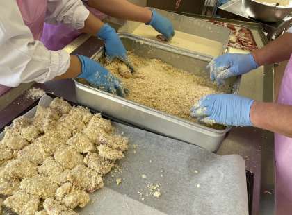 流れ作業で、肉に衣をつけていきます。