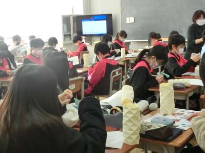 都立産業技術高等専門学校の先生は、折り紙の技術を中心に授業をしてくださいました。折り紙のが缶コーヒーやアルコール飲料の缶に応用され強度や使いやすさにいかされていることを学び実際に上出紙で折ってみました。最後は「三浦折り」に挑戦しました。この折り方が太陽光パネルに応用され宇宙に運ばれたことには驚きました。