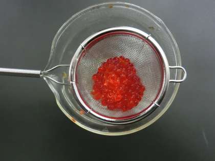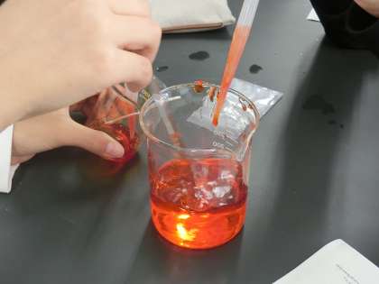 都立園芸高校の先生による授業です。今日は「コピー食品について」考える授業で実際に「人工のイクラ」を作ってみました。ビーカー内で物質を溶かしかき混ぜあわせていくと底に物質が沈殿してきました。それらをすくい上げてみると見た目は本物のイクラのようなものが出来上がりました。