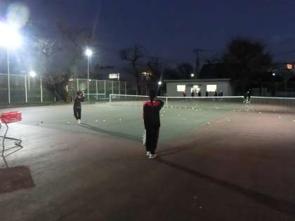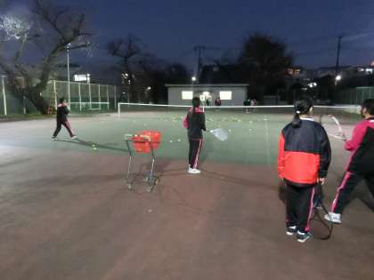 女子テニス部は24日に研修大会を予定しています。気温が低くなる中ナイター照明の下で練習に励みました。