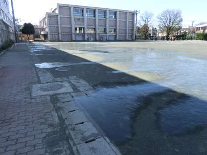 昨日の寒さで今朝はグランドの日影が凍ってしまいました。午前中には融けて大部分は乾きましたが、まだ一部に水たまりが残っています。