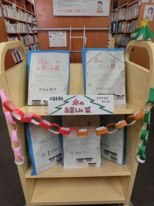 本のお楽しみ袋・・図書委員がテーマを決めてそれに即した本を三冊袋に詰めました。中には何の本が入っているかはお楽しみです。メディアセンター内に用意してあります。