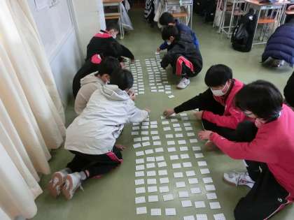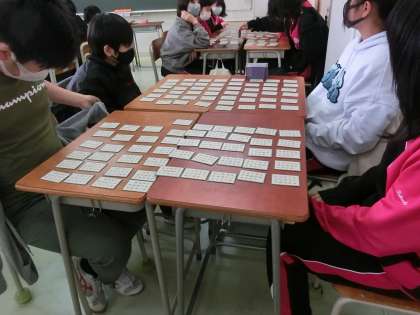 本日の4時間目、1年生は全クラス百人一首を行いました。机を寄せて札を並べるクラス、床に並べるクラスなどどちらも班にわかれて競います。