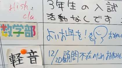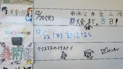 職員室前のボードです。よいお年をと書いた数学部、都大会に向けた演劇部、冬休みもがんばれ。