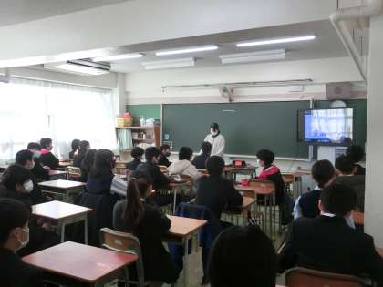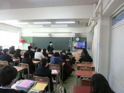 校長先生のお話の後、生徒指導部長の先生から学校生活についてのお話がありました。最後は音楽の先生の歌唱による校歌を配信いたしました。