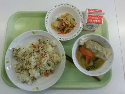 今日から三学期の給食が始まりました。今日の給食はおみくじ給食。何かというと、水餃子の中身が海老(長寿)、タコ(多幸)、ウインナー(勝利)の3種類あります。さて、何が出てくるか食べてみてのお楽しみです。