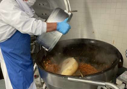 炊飯器の釜3つ分をいっきに炒めていく作業は迫力がありますよ。