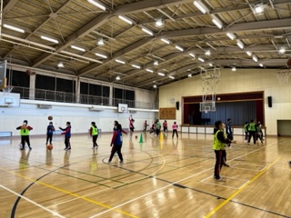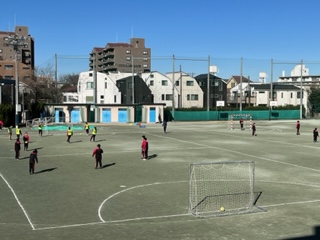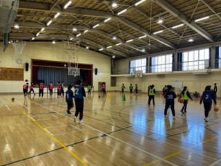 3年生は体育館でバスケットボール、校庭でハンドボールをしました。