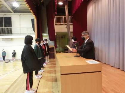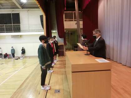区立中学校第74回生徒競書会金賞受賞者です。1年生男子、1年生女子の受賞の様子ですおめでとうございます。