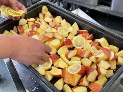 深さのある鉄板に、りんごとレモン、砂糖などの調味液を入れ蓋をして加熱しました。加熱するとりんごの風味の入ったシロップができます。このシロップもりんごと一緒にヨーグルトと食べるのがおすすめです。