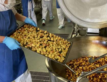 今日のデザートは、揚げたさつまいもと焼いたりんごを甘いタレに絡めた飴がらめです。揚げることで油分がとれる「のどの潤い」を意識したメニューです。