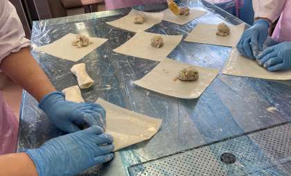 えび春巻きは、包む具材から給食室で作ります。具材を練ったら皮でどんどん巻いて揚げる準備をしていきます。