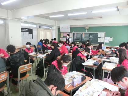 1年の社会の授業です。班で互いに調べたことを話し合いあまとめていきました。単元は織田信長、豊臣秀吉の全国統一でした。
