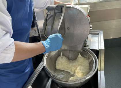 給食の食材は、ほとんどの場合は調理員さんが包丁で切っていますが大根おろしは機械で作ります。ほどよく汁気がきれるようにザルとボールで受けたものを釜に移します。調味料と合わせて加熱して「おろしだれ」を作ります。