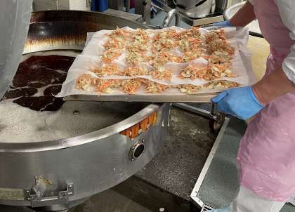 給食でかき揚げを作るときは、クッキングシートに形作ってから揚げていきます。家庭やお店で作るのも大変な料理ですが、大量調理でも作れるように工夫しています。