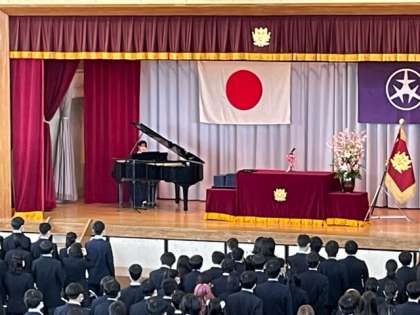 国歌斉唱。音楽の先生の伴奏で斉唱しました。