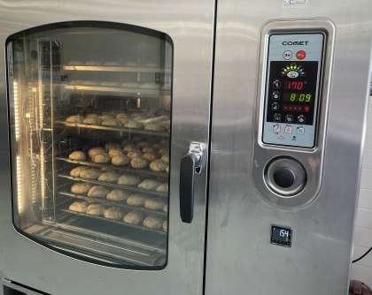 給食ではスチームコンベクションオーブンを使っています。厚みが均等になるように成形し、湿度を入れてじっくり加熱しました。