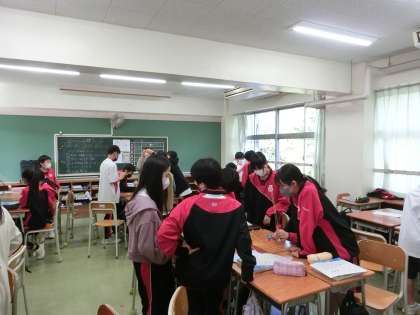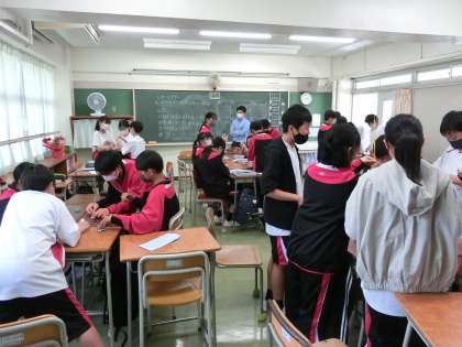 1年生の社会の授業です。班を造りその班の「国名」を決めました。そのあとは20分間で竹ひごを用いてタワーを造りてっぺんにスポンジを取り付けます。20分間でどの班が一番高いタワーを建てることができるかの競いました。どの班も話し合い協力してつくることができました。