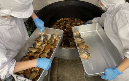 鯖を煮つけて各クラスの食缶に配缶している様子です。この後、煮汁をこしてから水溶き片栗粉で濃度をつけてタレを作ります。