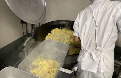 写真は、できあがったパエリアを各クラスの食缶へ移しているところです。