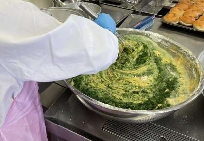 生地は、卵や薄力粉を混ぜたものに、茹でてからミキサーにかけた小松菜を混ぜています。