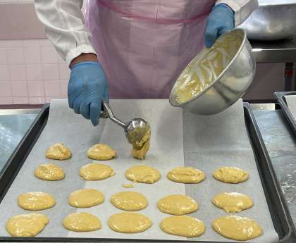 鉄板に生地を置いていくと、重みで自然と広がっていきます。