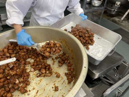 玉ねぎをすりおろして使っているのでカツオに味がよく絡み、ご飯が進みます。全体量を計量して、クラスごとに分けていきました。