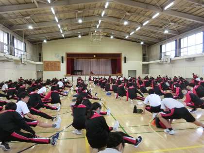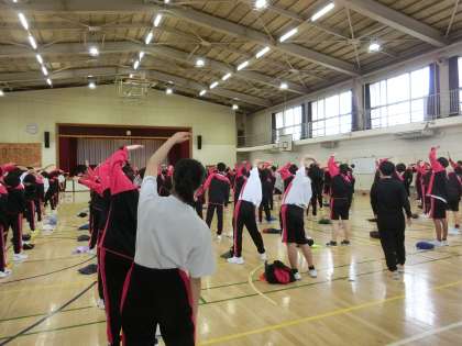 3年生の放課後練習は校庭の一部に水たまりができていたため体育館で行いました。まずは準備運動です。