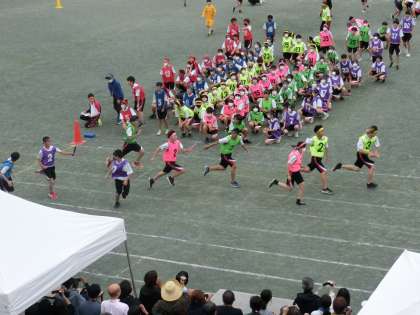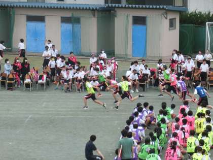 午前の部の最後は3年の全員リレーです。3年生にとっては最後の運動会。全員でバトンをつなぎます。