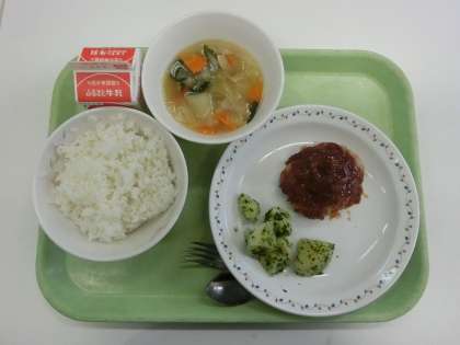 今日は今月の図書コラボ給食の日でした。今月は、いとうみく著『二日月』より「チーズハンバーグ」でした。「おいしい!」大好評でした。