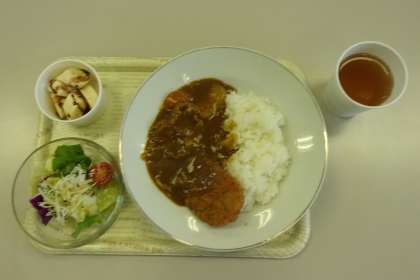 今日のメニューはコロッケカレーです。サラダとチョコバナナがつきました。「おいしい」「おいしい」連続です。卒業生や在校生も手伝ってくれました。ありがとうございました。