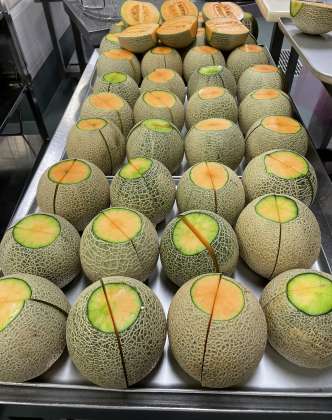 今日使う分のメロンが並んでいます。洗浄して、半分にカットしたので、この後タネを取り除いて1人分ずつに切り分けていきます。
