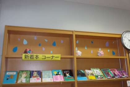 明日あから6月。メディアセンターの新刊本コーナーを図書委員が装飾してくれました。6月は梅雨イメージでしょうか。雨のしずくが書架をいろどりました。
