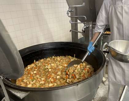 できあがった「そぼろ煮」を各クラスの食缶に配缶しています。彩りになるサヤインゲンは仕上げ直前に加えて色が残るようにしています。