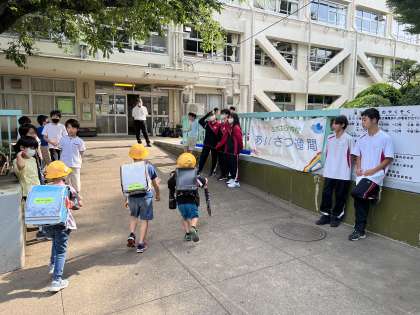 今週は火曜日から金曜日にかけて、生活委員があいさつ運動をしています。今日は笹原小学校です。明日は桜丘小学校で行います。