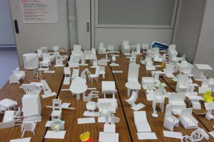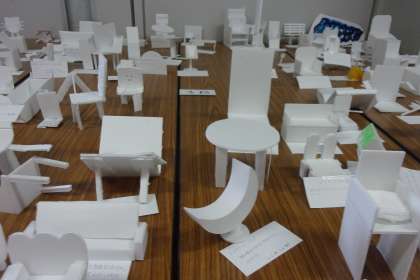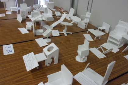 3年生の美術の作品です。テーマは「椅子」。個性豊かな椅子が並びました。