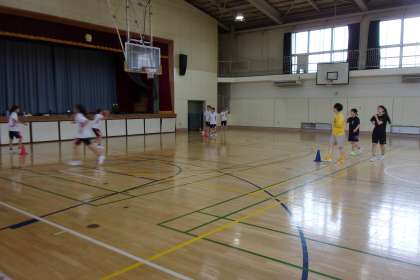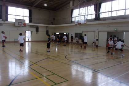 バスケットボール部の活動です。男女に分かれそれぞれがコートいっぱいを使って走り回りました。