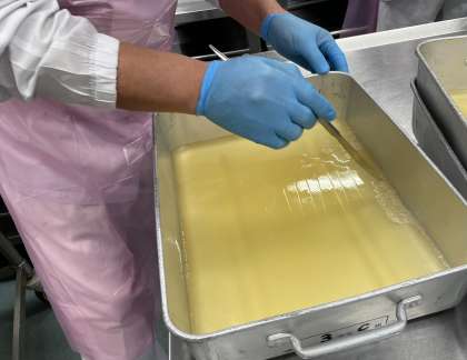 入梅メニュー2つめ、梅蜜ポンチを作っているところです。りんごのゼリーとフルーツをあわせ、梅シロップを加えてほんのり梅風味に仕上げています。