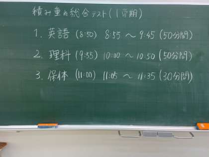 今日は積み重ね総合テストの2日目です。英語、理科、保健体育を実施いたします。なお、本日も給食はありません。午前中で下校となります。