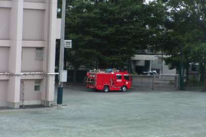 校庭の南側に消防車が・・?ご安心ください。隣の保育園の防災訓練に来たのです。