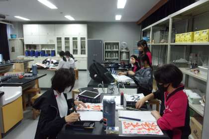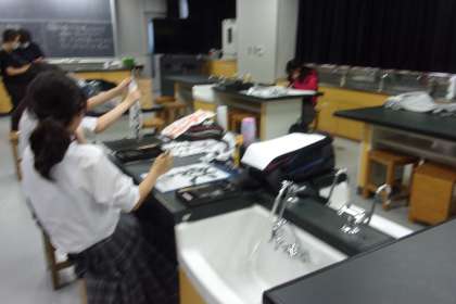 書道部の活動風景です。これまで多くのコンクールで優秀な成績を収めている書道部です。毎週理科室でコツコツと活動を続けています。日々の積み重ねの成果ですね。