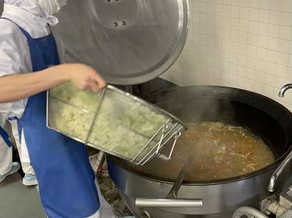 今日のスープには7種類の野菜を入れました。給食の汁物は鶏がらで出汁をとるところから始まり、野菜も煮え方などを考えながら作っています。