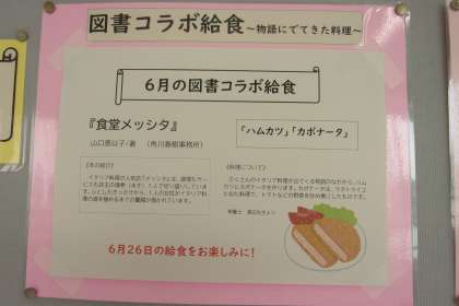 今日は6月の図書コラボ給食です。きょうは山口恵以子著『食堂メツシタ』より「ハムカツ」と「カポナータ」でした。カポバータは夏野菜を中心に炒め煮にしたイタリヤ料理で、程よい歯ごたえのハムカツと一緒においしくいただきました。