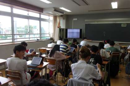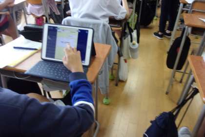 2年生の学活です。こちらは上級学校についてタブレットを利用して調べました。
