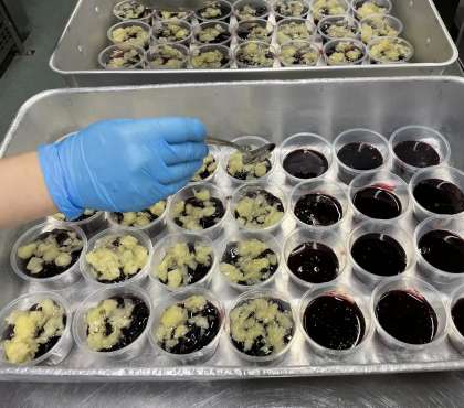 七夕にちなみ、夜空に輝く星をイメージした『夜空のゼリー』を作りました。ぶどうゼリーの上に、ほんのりレモン味のゼリーとパインを散らしています。