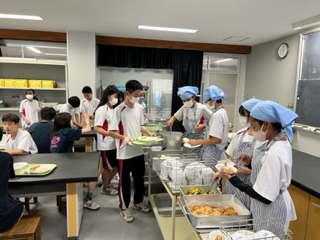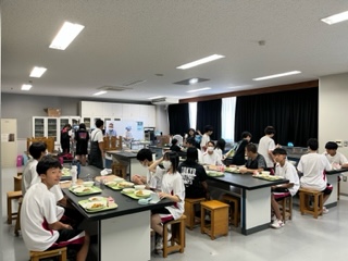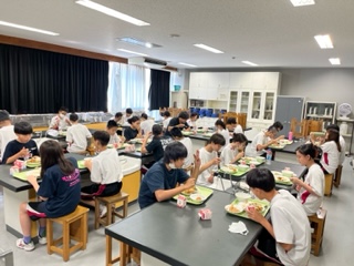 暑さ対策のため2年生のあるクラスでは理科室や美術室などで給食の時間としました。