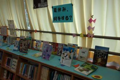 課題図書コーナーの隣には「夏休み、何をする?」のコーナーを設けました。こちらには料理、筋トレ、スポーツ、名所めぐりなど夏休みにチャレンジすると楽しそうな本を並べてみました。こちらも図書委員が飾りつけをしました。
