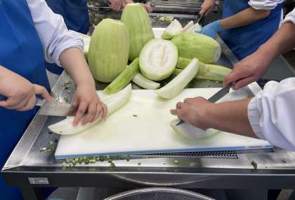 夏野菜の豚キムチには、ピーマン、なす、枝豆を使っていますが、今日はスープにも夏野菜『冬瓜』を使っています。大きな野菜なので家庭ではなかなか丸ごと買わなくなってきているかもしれません。