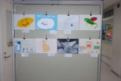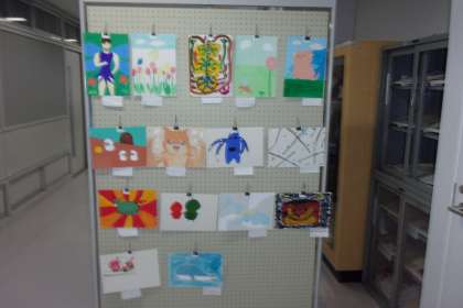 3年生の美術で描いた「創造の動物」を掲出しました。各クラスの面談場所の近くに展示してあります。A組は北校舎1階にあります。